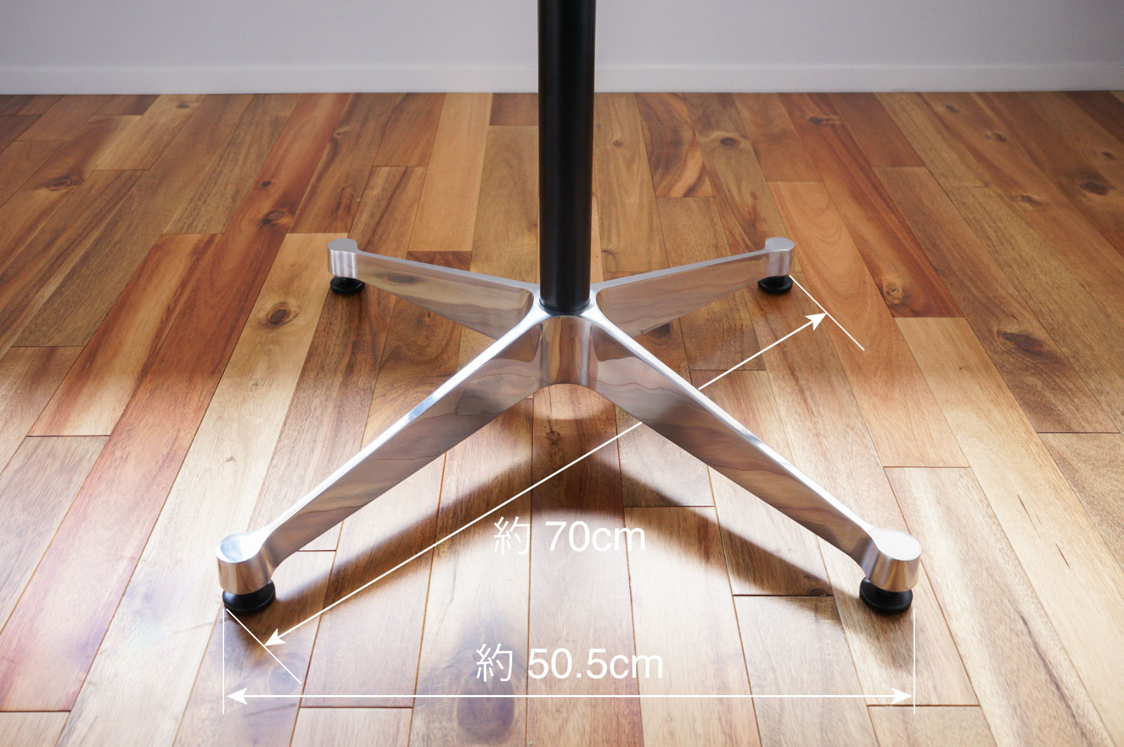 天板を支える1本脚のベースは、どちらのサイズでも共通です。先端の距離は隣同士の先端で約50.5cm、対角上の先端で約70cmとなります。また、ベース先端にはがたつき調整のアジャスターが付属、約1.5cmの範囲で調整ができます。