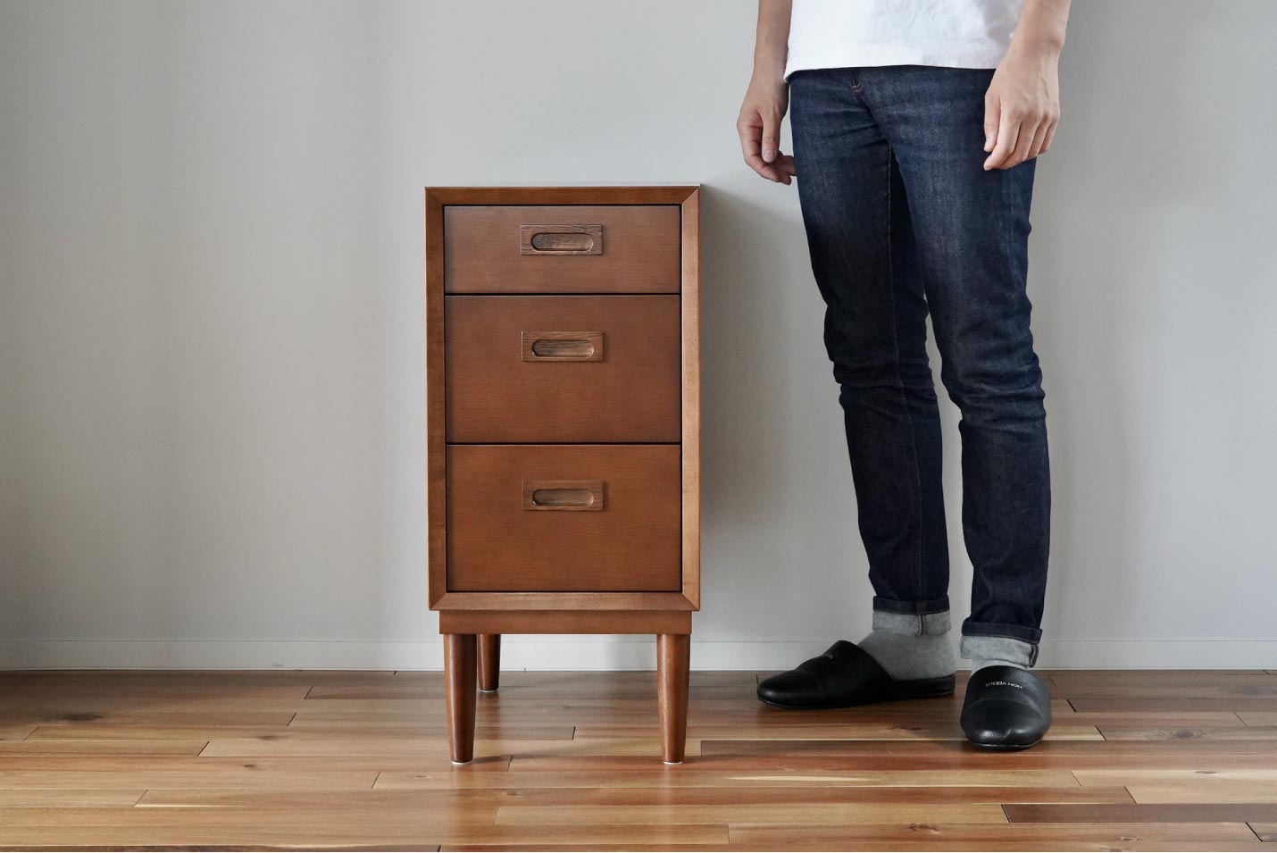 カリモク60+ チェストと身長170cmのスタッフとの比較。単品で電話台として使ってみるのも良いかもしれません。