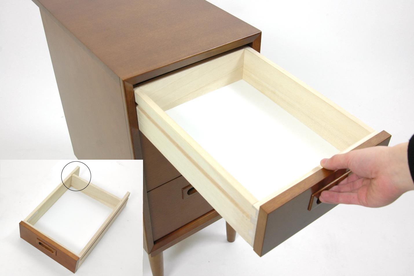 引き出しはアリ組接合という昔ながらの手法で組み立てられており、耐久性も抜群です。