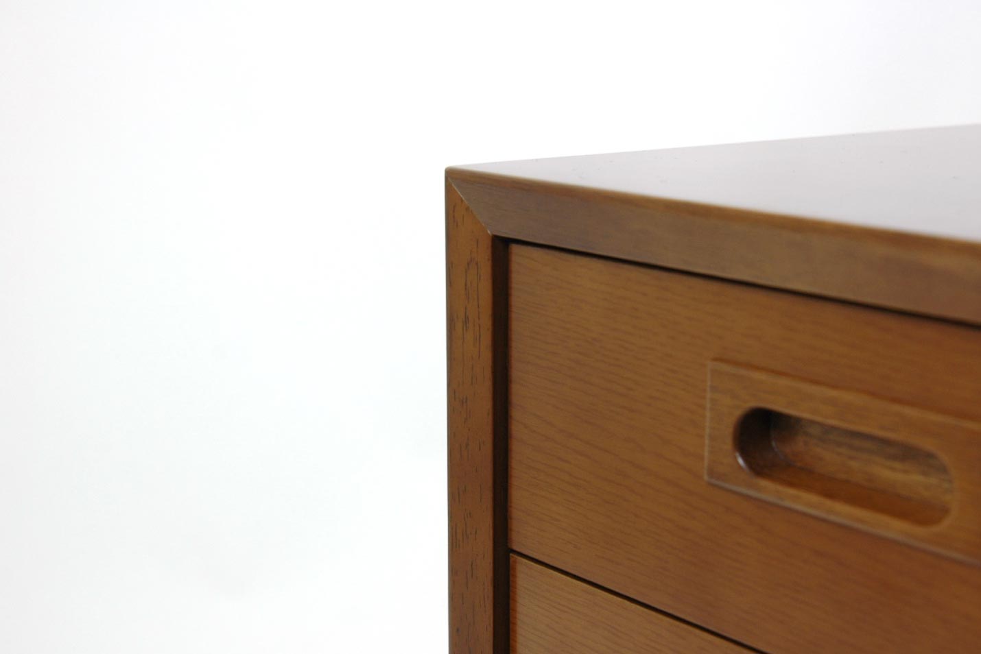 引き出しの表面が5mm下がっていることで、留め接合の枠が活き、立体感が生まれます。当然下げた分だけ塗装範囲は広がりますが、そこはカリモク、手を抜くことはありません。