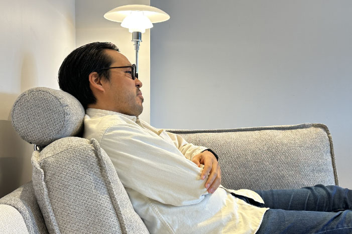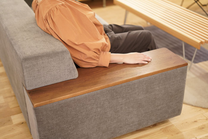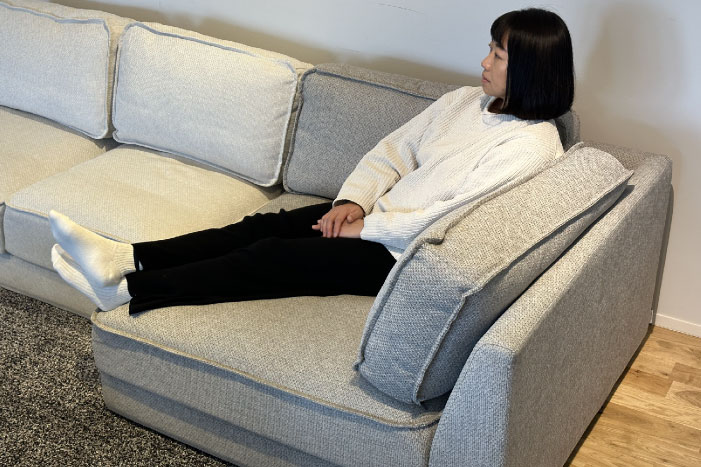 低い背もたれは目線を遮ることなく、肘置きとしてや頭を置いて枕代わりなど色々な姿勢をサポート。
