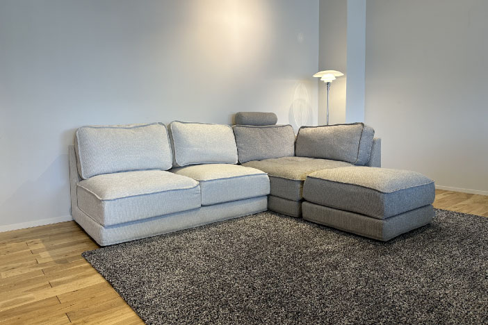 正方形のコーナーラージは斜めに座る事で足を伸ばすことができ快適に過ごせます。通常のカウチより長さを抑えることができ、リビングの動線も広がります。