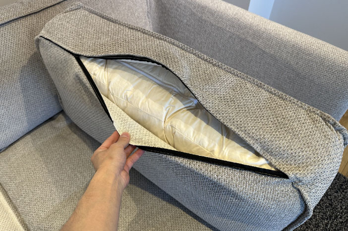 座クッションはフェザーとウレタン綿を採用。贅沢ながらも安定的な座り心地が得られる構造です。