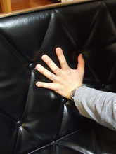 見てわかるとおり、ロビーチェアの背もたれは等間隔にボタンが配置されています。試しに手のひらで力強く押してみましたが、力が均等にかかるためか、ちょうど良い跳ね返しを体感しました。