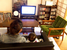 我が家では、食事はダイニングルーム、そのほかのほとんどの時間をロビーチェアがあるリビングで過ごします。平日の昼間はもっぱら私と子供の特等席。