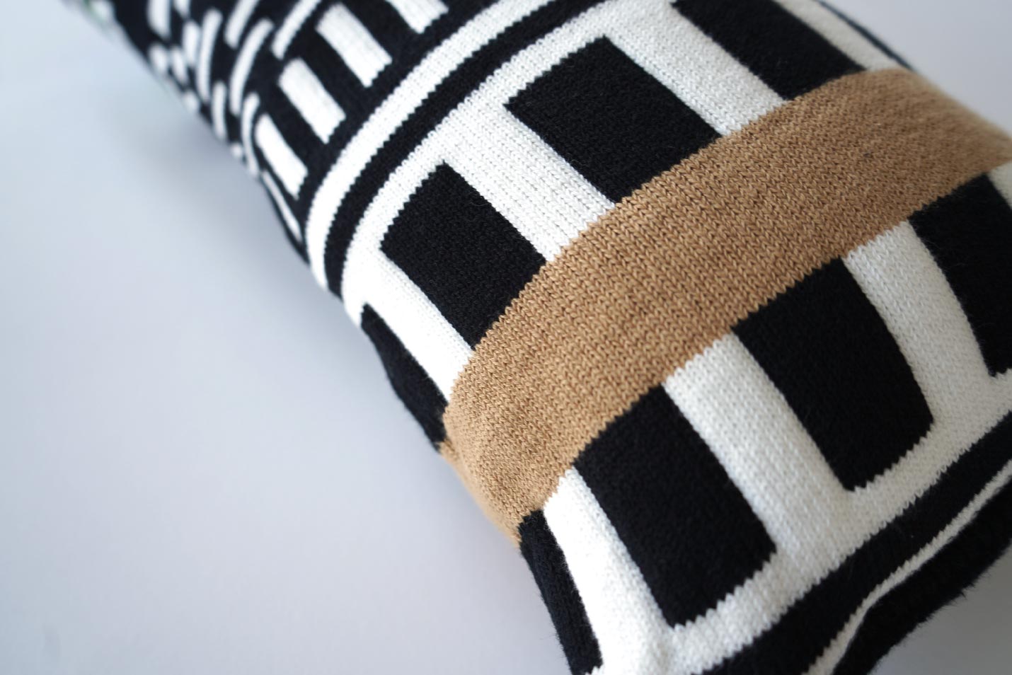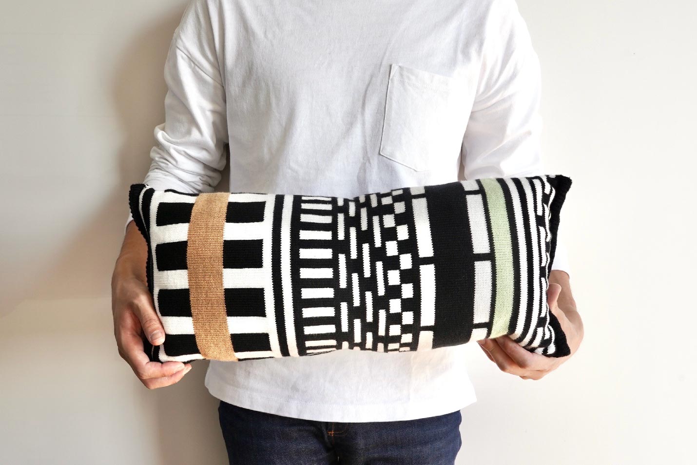 個性的なストライプ柄があしらわれたカバーはよくある印刷ものではなく、カリモクの自社工場で織られた精度の高いニット製。見た目の華やかさだけでなく、柔らかな触り心地もこのストライプスクッションの魅力の一つなのです。