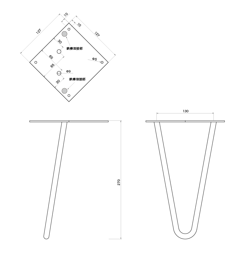 その名の通り、鉄の棒をヘアピンのように曲げただけのシンプルなレッグとなります。12.7cm角の座金にしっかり溶接した鉄だからこそ実現できる形状となります。
