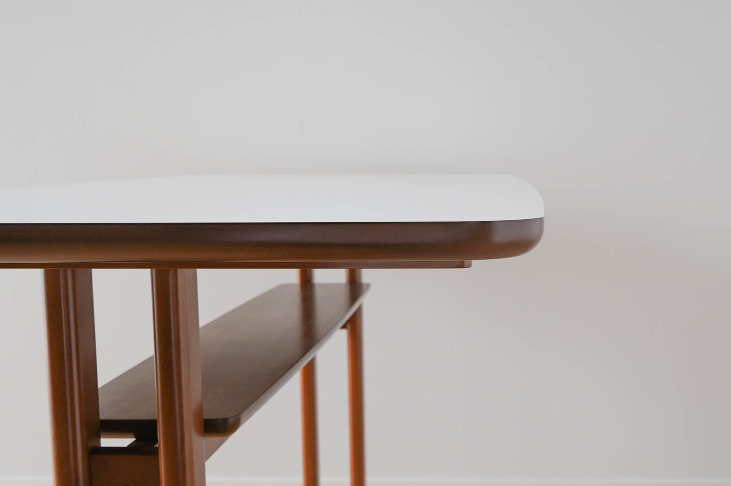 Kチェアで食事を楽しめるようにと考え抜かれたサイズ感は、Kチェアに腰掛けながらゆったりと食事をするのにぴったり。出入りしやすいように天板には緩やかなカーブが施されています。